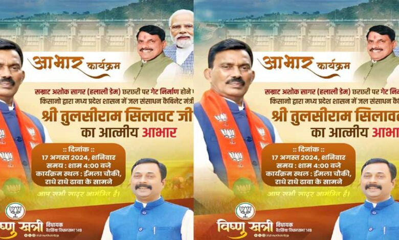 जल संसाधन मंत्री तुलसीराम सिलावट बैरसिया वासियों को सम्राट अशोक सागर (हलाली डेम) का छरछरी पर गेट निर्माण होने पर क्षेत्र के किसान एवं रहवासी आत्मीय स्वागत करेंगे।उल्लेखनीय है कि बैरसिया विधायक विष्णु खत्री के अथक प्रयासों से हलाली डेम का नाम सम्राट अशोक सागर किया गया है। इससे पूर्व हलाली नदी का नाम भी बाणगंगा नदी किया गया है।साथ ही ईंटखेड़ी स्थित नदी घाट पर शौर्य स्मारक का निर्माण कर क्षेत्र वासियों को विधायक विष्णु खत्री ने सौगात दी थी।