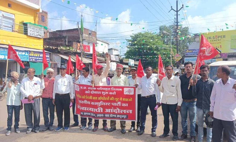 भारतीय कम्युनिस्ट पार्टी जिला अनूपपुर की ओर से अनूपपुर मुख्यालय स्थित बस स्टैंड पर एवं कोतमा एसडीएम कार्यालय के समक्ष मध्य प्रदेश राज्य परिवहन निगम चालू करने की मांग को लेकर क्रमशः कलेक्टर अनूपपुर और एसडीएम कोतमा को ज्ञापन सोपा गया भारतीय कम्युनिस्ट पार्टी ने ज्ञापन में यह उल्लेखित किया है कि समूचे मध्य प्रदेश में रेल सेवाओं के मामले में अत्यंत पिछड़ा हुआ है ।रेल विभाग ने कुछ सालों से सुनियोजित तरीके से सस्ती टिकट वाली पैसेंजर ट्रेन या तो बंद कर दी है या उन्हें महंगे किराए वाली एक्सप्रेस ट्रेन में बदल दिया है ,और एक्सप्रेस ट्रेन में जनरल और स्लीपर कोच लगातार घटाकर आम आदमी की पहुंच से बहुत से दूर कर दिया गया है दूरस्थ ग्रामीण अंचलों में आम जनता यातायात के लिए पूरी तरह से निजी बस सेवा पर निर्भर है जिनमें मनमर्जी से किराया वसूला जाता है बसों में लोगों का जान जोखिम में है क्योंकि ना तीन गाड़ियों का कोई फिटनेस होता है और ना ही देखभाल यात्रियों को बसों में जानवरों की तरह ठूंसा जाता है और आए दिन बस दुर्घटना का शिकार होकर यात्रियों को जान लेती रहती है ।