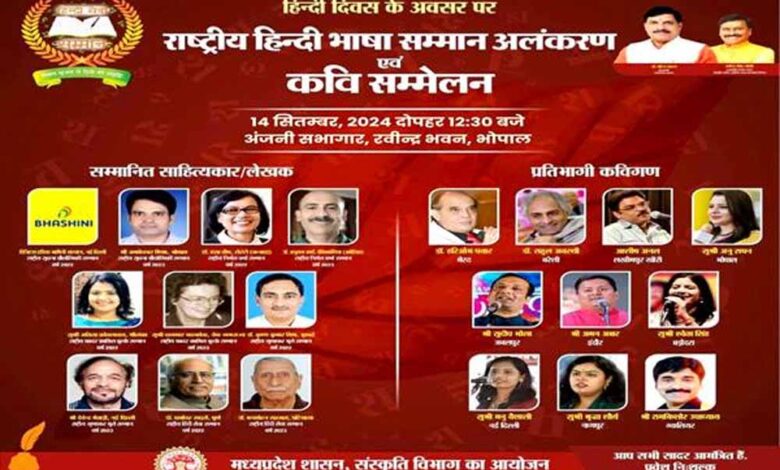 हिन्‍दी दिवस के अवसर पर संस्‍कृति विभाग द्वारा राष्‍ट्रीय हिन्‍दी भाषा सम्‍मान अलंकरण समारोह एवं अखिल भारतीय कवि सम्‍मेलन का आयोजन 14 सितम्‍बर, 2024 शनिवार को रवीन्‍द्र भवन स्थित अंजनी सभागार में दोपहर 12:30 बजे से किया जाएगा। इस अवसर पर हिन्‍दी भाषा के साहित्य सृजन में उत्कृष्ट कार्य करने के लिए देश और दुनिया के प्रतिष्ठित लेखकों का सम्‍मान किया जाएगा।