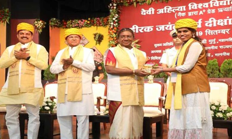 राष्ट्रपति श्रीमती मुर्मू आज इंदौर में देवी अहिल्या विश्वविद्यालय के हीरक जयंती समारोह के अवसर पर 14वें दीक्षांत समारोह को सम्बोधित कर रही थीं। समारोह में राष्ट्रपति श्रीमती मुर्मु ने विद्यार्थियों तथा शोधार्थियों को स्वर्ण तथा रजत पदक और उपाधियाँ वितरित की।