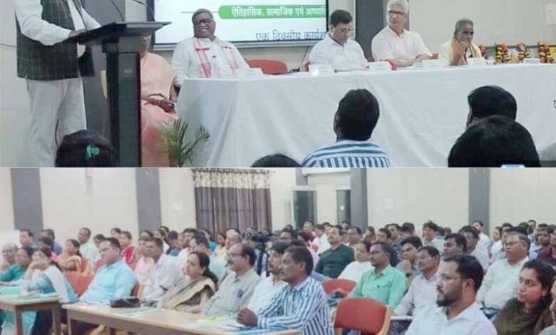 जनजातियों के गौरवशाली इतिहास, सामाजिक और आध्यात्मिक योगदान को अधिक से अधिक लोगों तक पहुंचाने और जनजातीय महानायकों के बलिदान को आमजनों को बताने के लिए एक दिवसीय कार्यशाला पं. रविशंकर शुक्ल विश्वविद्यालय के सभाग्रह में संपन्न हुई। इस कार्यशाला में पूर्व आईएएस अधिकारी और वर्तमान केशकाल विधायक श्री नीलकंठ टेकाम ने जनजातियों के ज्ञान और परंपराओं को दूसरे समाजों के लिए भी अनुकरणीय बताया। कार्यशाला को संबोधित करते हुए उन्होंने कहा कि जनतीय समाज में सहभागिता, प्रकृति प्रेम के साथ आत्म स्वाभिमान से जीने की कला को दूसरे समाज के लोंगो को भी सीखना चाहिए। श्री टेकाम ने इस दौरान जनजातीय समाज को भारत के संविधान को मिली सहूलियतों और संरक्षण के साथ विकास के लिए किए गए प्रावधानों को भी लोंगो को बताया। इस दौरान वीरांगना रानी दुर्गावती की 500वीं जयंती भी मनाई गई और रानी दुर्गावती के अपने गोंडवाना प्रदेश की स्वतंत्रता की रक्षा के लिए बलिदान हो जाने के वृत्तांत पर भी प्रकाश डाला गया है। कार्यशाला में पं. रविशंकर शुक्ल विश्वविद्यालय के दो सौ से अधिक छात्र-छात्राओं एवं नागरिक शामिल हुए।