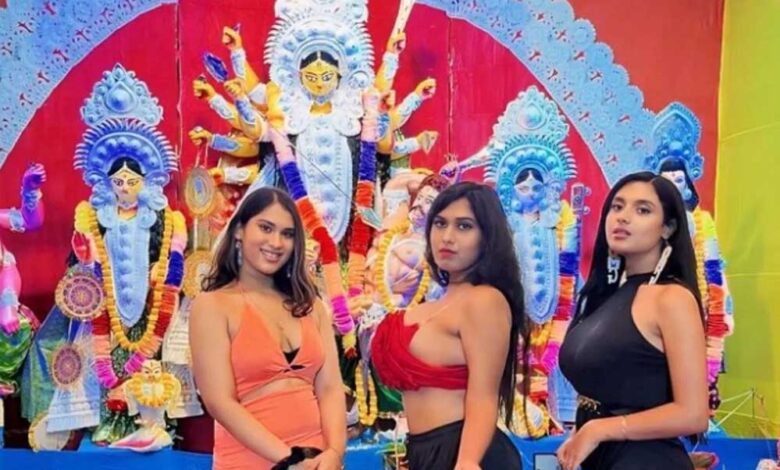 कोलकाता में दुर्गा पंडाल में ऐसे कपड़े पहनकर पहुंची मॉडल, लोग भड़के