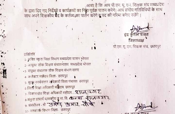 उच्च माध्यमिक शिक्षक संघ की प्रदेश इकाई के द्वारा समुचित प्रदेश में अपने संगठन का विस्तार कर जिला अध्यक्ष सहित ब्लॉक स्तर पर पदाधिकारी और सदस्यों कि नियुक्तियों कर संगठन को मजबूत बनाने का काम किया जा रहा है इसी क्रम में इंद्र कुमार रावत उच्च माध्यमिक शिक्षक को छतरपुर जिले का जिला अध्यक्ष बनाया गया इसके उपरांत जिला अध्यक्ष नियुक्त होने के बाद इंद्र कुमार रावत उच्च माध्यमिक शिक्षक जिला अध्यक्ष ने जिले के समस्त विकास खंडो में ब्लॉक अध्यक्ष की नियुक्तियां करने पर सहमति बनाई जिसमें राजनगर विकासखंड में उच्च माध्यमिक शिक्षक प्रमोद कुमार चौबे जो राजनगर के गर्ल्स हायर सेकेंडरी स्कूल में पदस्थ है को राजनगर विकासखंड का ब्लॉक अध्यक्ष बनाया गया है और साथ ही पी.एम.यू.एम. शिक्षक संघ मध्य प्रदेश के द्वारा दिए गए निर्देशों कार्यक्रमों का निष्ठा पूर्वक पालन करने एवं संघ कि गतिविधियों के साथ-साथ अपने शिक्षक के कर्तव्य का पालन करने के निर्देश दिए, इसके उपरांत प्रमोद कुमार चौबे द्वारा यह सपत लेते हुए जानकारी दी गई कि हम प्रदेश संगठन के आधार पर अपने कर्तव्यों का पालन अपनी ईमानदारी से ब्लॉक स्तर पर जिम्मेदारी पूर्वक कार्य करेंगे