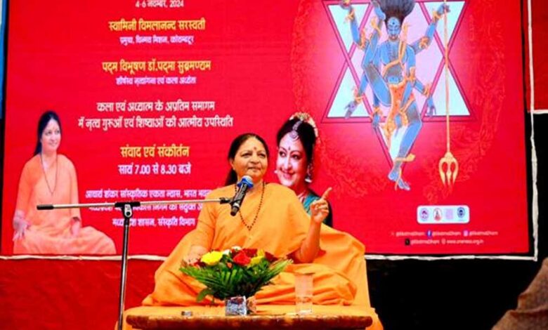 कार्यशाला के अगले सत्र में चिन्मय मिशन कोयंबटूर की प्रमुख स्वामिनी विमलानंद सरस्वती ने कहा कि कला का सौन्दर्य आनंद में है। कला की विशेषता है कि उसमें सदैव नवीनता विद्यमान होती है। उन्होंने कहा कि भगवान आसन पर बैठे तो कला है और चलें तो नृत्य है। स्वामिनी ने कहा कि नृत्य भी एक साधना है, जिससे मन परिष्कृत होता है। चर्चा सत्र को आगे बढ़ाते हुए स्वामिनी विमलानंद ने वेदांत का उदारहण देते हुए कहा कि आत्मज्ञान के लिए मन की शुद्धता, सूक्ष्मता एवं एकाग्रता आवश्यक है। आत्मज्ञान की प्राप्ति ज्ञान मात्र से होती है, इसलिए आवश्यक है कि मन राग, द्वेष से मुक्त हो।