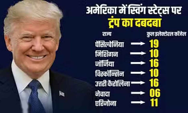 अमेरिका में स्विंग स्टेट उन राज्यों को कहा जाता है, जहां पार्टियों का समर्थन बदलता रहता है। मतलब जहां अमेरिका के कई राज्यों में पहले से विभिन्न सर्वे में पता चल जाता है, कि इन राज्यों में किस पार्टी को जीत मिलेगी, वहीं कुछ राज्यों में बेहद कड़ा मुकाबला होता है और वहां किसी भी पार्टी का पलड़ा भारी हो सकता है। यही वजह है कि इन राज्यों को स्विंग स्टेट कहा जाता है और राष्ट्रपति चुनाव में किस उम्मीदवार को जीत मिलेगा, उसमें इन स्विंग स्टेट की अहम भूमिका होती है। 2024 के चुनाव में सात स्विंग स्टेट थे जिनमें पेंसिल्वेनिया, मिशिगन, जॉर्जिया, विस्कॉन्सिन, उत्तरी कैरोलिना, नेवादा, एरिजोना का नाम शामिल रहा। अब चुनाव नतीजों में सातों स्विंग स्टेट में ट्रंप का जीतना ऐतिहासिक है।