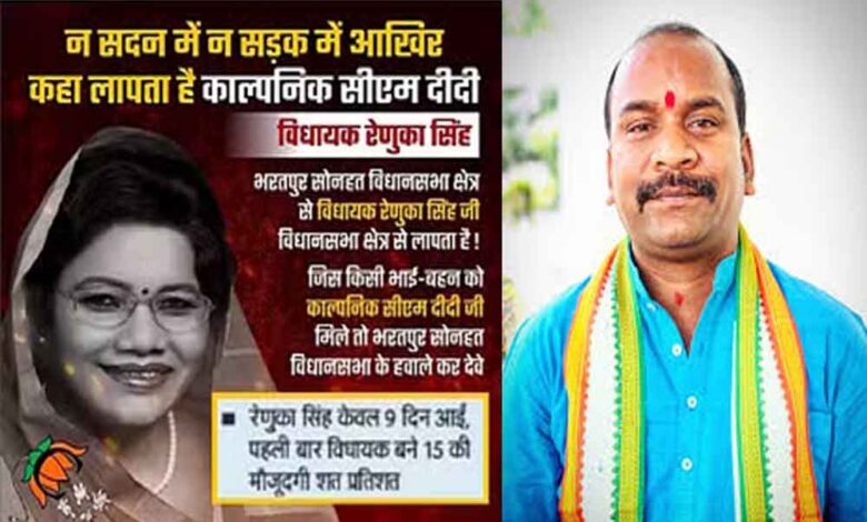 प्रदेश की पहली विधानसभा भरतपुर सोनहत की विधायक और पूर्व केंद्रीय राज्यमंत्री रहीं रेणुका सिंह इन दिनों चर्चा में हैं। चर्चा में रहने का कारण उनके नाम के पोस्टर हैं। भरतपुर सोनहत विधानसभा से पूर्व विधायक गुलाब कमरो ने रेणुका सिंह के लापता विधायक के पोस्टर सोशल मीडिया में पोस्ट करते हुए लिखा है, बेटियों की लुट रही है अस्मत, लापता विधायक मंत्री बनने कर रही है कसरत।