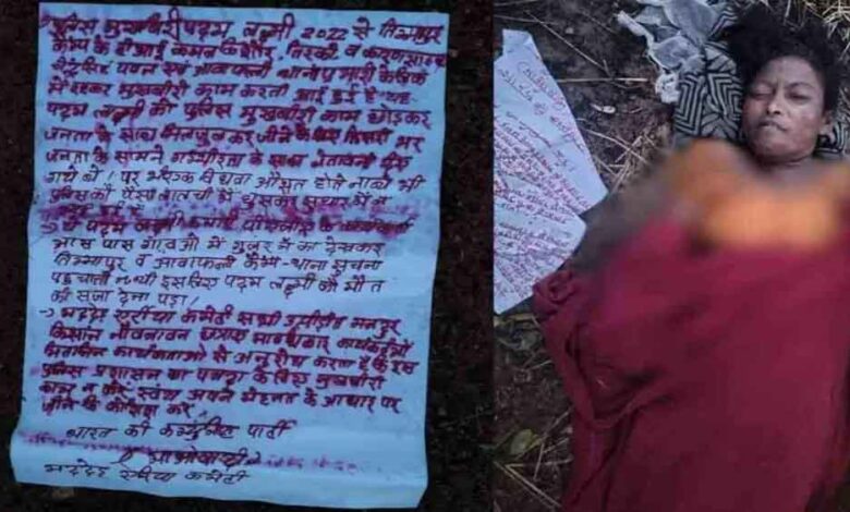 उन्होंने बताया कि इसकी सूचना मिलने के बाद पुलिस की एक टीम मौके पर पहुंची और शव को पोस्टमार्टम के लिए भेज दिया गया। घटनास्थल पर माओवादियों की मद्देड़ क्षेत्र समिति द्वारा जारी एक पर्चा मिला है, जिसमें उन्होंने महिला पर पुलिस मुखबिर के रूप में काम करने का आरोप लगाया है।