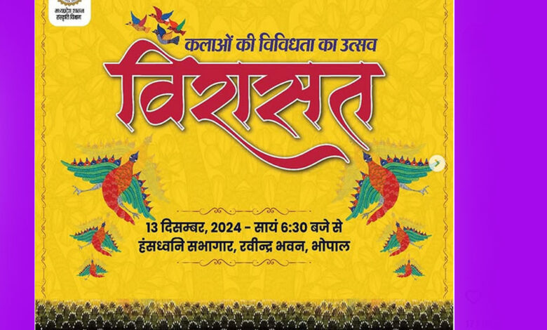 मध्यप्रदेश शासन, संस्कृति एवं जनसम्पर्क विभाग द्वारा संयुक्त रूप से सांस्कृतिक संध्या का संयोजन किया जा रहा है। इसमें कलाओं की विविधता का उत्सव ''विरासत'' का आयोजन 13 दिसम्बर, 2024 को रवीन्द्र भवन स्थित हसंध्वनि सभागार, भोपाल में किया जा रहा है। यह कार्यक्रम सायं 6:30 बजे से प्रारम्भ किया जाएगा। कार्यक्रम में मुख्यमंत्री डॉ. मोहन यादव मुख्य अतिथि होंगे। कार्यक्रम की अध्यक्षता राज्यमंत्री (स्वतंत्र प्रभार) संस्कृति, पर्यटन, धार्मिक न्यास एवं धर्मस्व धर्मेन्द्र सिंह लोधी करेंगे। कार्यक्रम में मंत्रीगण सहित जनप्रतिनिधि भी विशेष रूप से उपस्थित रहेंगे।