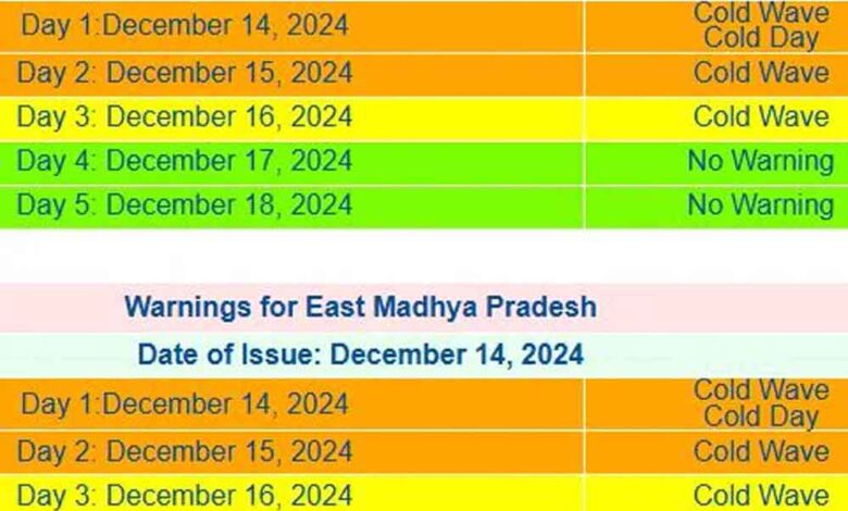 नीमच, राजगढ़, बैतूल, धार, इंदौर, उज्जैन, सीधी और नरसिंहपुर जिलों में कहीं-कहीं शीतल दिन देखा जा सकता है। कुछ जगहों पर शीत लहर भी चल सकती है। मौसम विभाग का कहना है कि 15 दिसंबर को मध्य प्रदेश के कुछ इलाकों में शीत दिवस की स्थिति देखी जाएगी। इसको लेकर यलो अलर्ट जारी किया गया है।