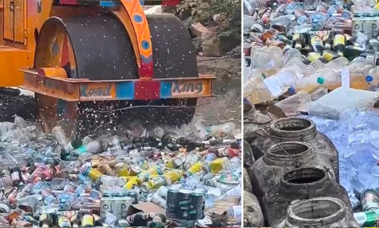 नर्मदापुरम में आबकारी विभाग ने 59.84 लाख की शराब पर चला बुलडोजर:आबकारी विभाग ने जब्त कर नष्ट करवाई