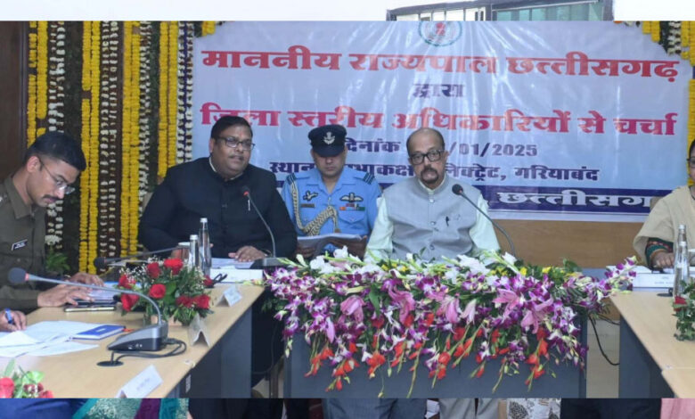 राज्यपाल रमेन डेका की अध्यक्षता में गरियाबंद कलेक्टोरेट सभाकक्ष में जिला स्तरीय अधिकारियों से चर्चा की। राज्यपाल डेका ने प्रशासनिक अधिकारियों से चर्चा करते हुए शासन की योजनाओं के प्रभावी क्रियान्वयन की अपेक्षा की। उन्होंने बैठक में स्वास्थ्य, शिक्षा, रोजगार सुपोषण एवं अन्य जनकल्याणकारी योजनाओं की विस्तृत जानकारी ली। कलेक्टर दीपक अग्रवाल ने जिले में योजनाओं के क्रियान्वयन एवं जिला प्रशासन द्वारा किये जा रहे विभिन्न कार्यों एवं आयोजनों के संबंध में विस्तृत जानकारी दी।