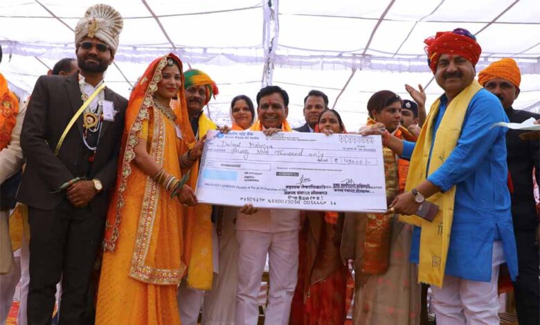 उप मुख्यमंत्री एवं प्रभारी मंत्री श्री देवड़ा ने कहा कि प्रधानमंत्री श्री नरेन्द्र मोदी ने सभी वर्गों के लिये योजनाएं बनाई है, योजनाओं का लाभ सभी को समान रूप से मिल रहा है। आयुष्मान योजना से सभी को 05 लाख रूपये तक का नि:शुल्क उपचार मिल रहा है। उज्ज्वला योजना से सभी को गैस कनेक्शन दिये गये है। सबके घर नल से जल पहुंचाया जा रहा है। उन्होंने सभी नव विवाहितों को बधाई दी।