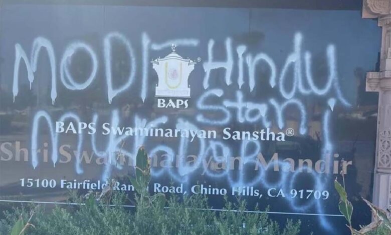 कैलिफोर्निया के चेनो हिल्स में स्थित बीएपीएस श्री स्वामीनारायण मंदिर को अपवित्र किए जाने के बाद व्यापक निंदा का सामना करना पड़ा। यह घटना हिंदू समुदाय के लिए एक बड़ा आघात थी।