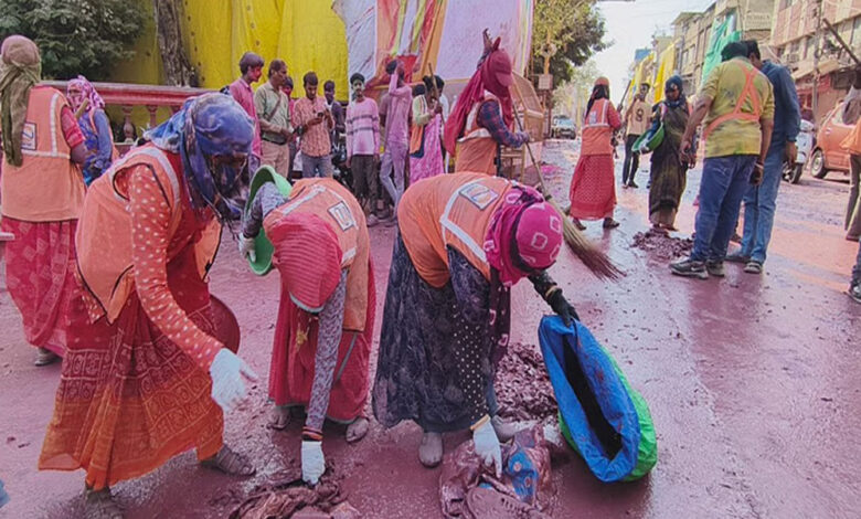 इंदौर में जहां-जहां से गेर गुजरी, वहां रंग और कीचड़ हो गया था। गेर निकलने के बाद नगर निगम के अमले ने आज फिर से यहां की सफाई को चुनौती के रूप में लिया। नगर निगम के अपर आयुक्त अभिलाष मिश्रा की देखरेख में मुख्य स्वास्थ्य अधिकारी डॉ. अखिलेश उपाध्याय द्वारा राजवाड़ा क्षेत्र और आसपास की गलियों में सफाई का अभियान प्रारंभ किया गया। मौके पर नगर निगम आयुक्त शिवम वर्मा और अपर आयुक्त रोहित सिसोनिया भी सफाई कर्मियों का हौसला बढ़ाने पहुंचे। नगर निगम के सफाई कर्मी वाकई सम्मान के पात्र हैं कि उन्होंने राजबाड़ा क्षेत्र की सफाई मात्र 38 मिनट में पूरी कर ली।