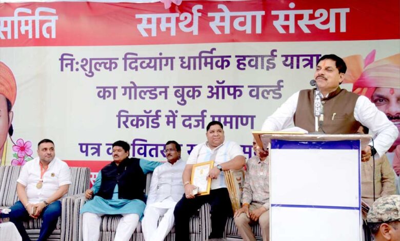 गोल्डन बुक ऑफ वर्ल्ड रिकार्ड में दिव्यांग जनों को नि:शुल्क धार्मिक यात्रा के प्रमाण पत्र वितरण के पश्चात मुख्यमंत्री डॉ. यादव ने कहा कि दिव्यांग जनों की सेवा ईश्वर की सेवा के समान है। समर्थ सेवा संस्थान के द्वारा यह एक अत्यंत प्रशंसनीय कार्य किया गया है जो की सबके लिए अनुकरणीय भी है। उल्लेखनीय है की समर्थ सेवा संस्थान के द्वारा अब तक 47 दिव्यांग जनों को धार्मिक हवाई यात्रा नि:शुल्क करवाई गई है। मुख्यमंत्री डॉ यादव ने अपनी ओर से संस्था के पदाधिकारीयों को शुभकामनाऐं दी।
