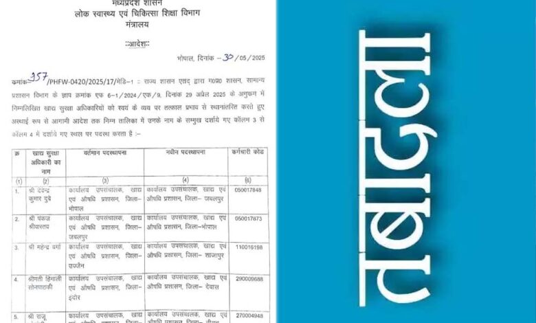 प्रदेश के 9 फूड सेफ्टी अधिकारी के तबादले, देवेंद्र दुबे का जबलपुर तबादला, पंकज श्रीवास्तव संभालेंगे भोपाल का प्रभार