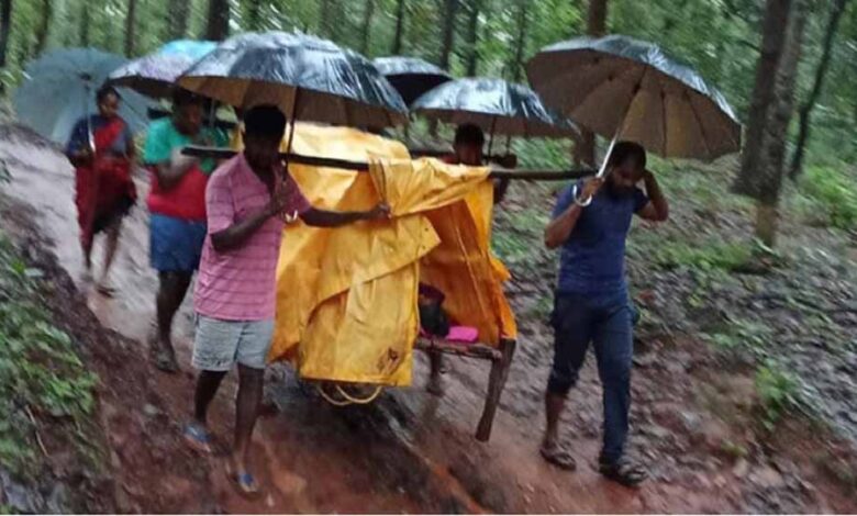 कोरबा में बारिश के दौरान मरीज को खाट पर लिटाकर सात किलोमीटर पैदल चलना पड़ा