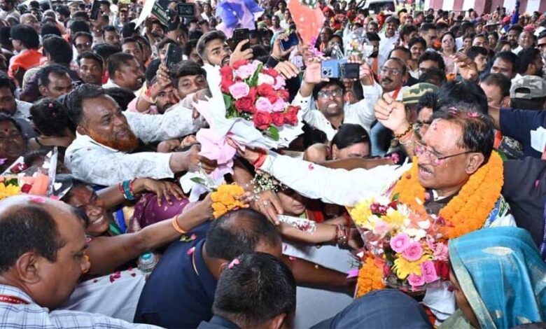 एयरपोर्ट पर हुआ भव्य स्वागत, कर्मा-पंथी नृत्यों से सराबोर रहा एयरपोर्ट परिसर