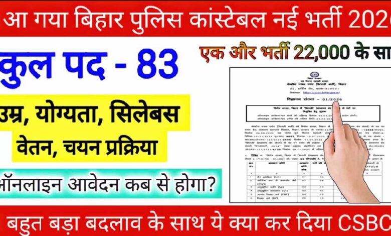 बिहार के युवाओं के लिए बड़ी खुशखबरी है. बिहार पुलिस की स्पेशल ब्रांच में सिपाही (कॉन्स्टेबल) के कुल 83 पदों पर भर्ती का ऐलान हो गया है. केंद्रीय चयन परिषद यानी CSBC ने इस भर्ती के लिए 29 जनवरी को आधिकारिक नोटिफिकेशन जारी कर दिया है. सामान्य प्रशासन विभाग, बिहार सरकार के आदेश के आधार पर यह भर्ती निकाली गई है.