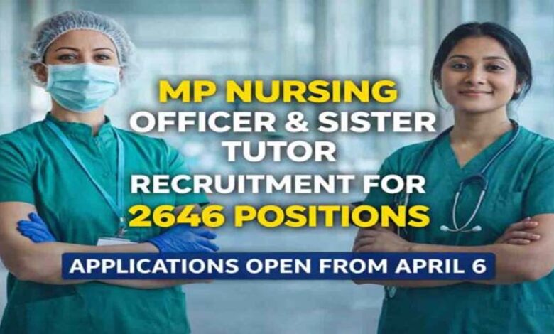 मध्य प्रदेश कर्मचारी चयन मंडल (MPESB) ने लोक स्वास्थ्य एवं चिकित्सा शिक्षा विभाग के तहत नर्सिंग ऑफिसर और सिस्टर ट्यूटर के 2, 646 पदों के लिए संयुक्त भर्ती परीक्षा-2026 का नोटिफिकेशन जारी किया है। आवेदन 6 अप्रैल से 20 अप्रैल के बीच लिए जाएंगे। वहीं, इसके लिए परीक्षा 15 मई 2026 से शुरू होगी।