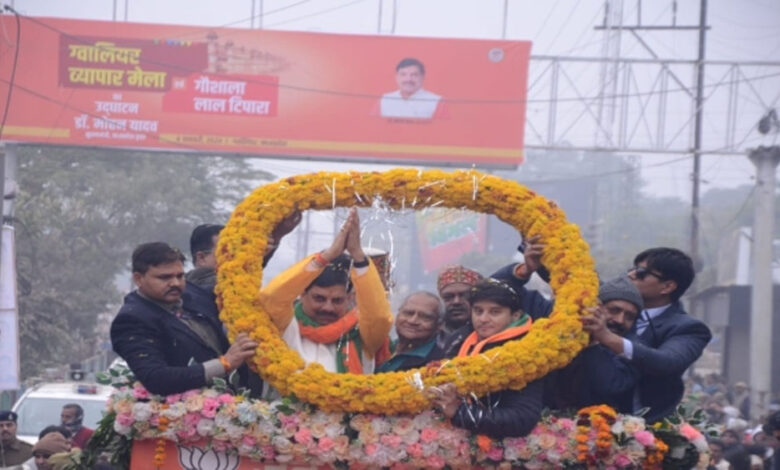 उपमुख्यमंत्री विजय शर्मा ने ली गृह विभाग की बैठक, कार्ययोजना प्रस्तुत करने के दिए निर्देश जन अभार यात्रा में लोगाें का आभार व्यक्त करने के बाद मुख्यमंत्री मोहन यादव लाल टिपारा गौशाला पहुंचे थे । उनके साथ केंद्रीय मंत्री ज्योतिरादित्य सिंधिया भी हैं। आभार यात्रा के दौरान शहर के अलग-अलग इलाकों में सीएम डॉक्टर मोहन यादव का जोरदार स्वागत किया गया। ऐतिहासिक नगरी एवं संगीतधानी ग्वालियर में मुख्यमंत्री डॉ मोहन यादव खुले वाहन पर सवार होकर जनता का आभार जताने निकले। आम जनता ने पुष्पवर्षा कर मुख्यमंत्री डॉ यादव का किया आत्मीय अभिनंदन।
