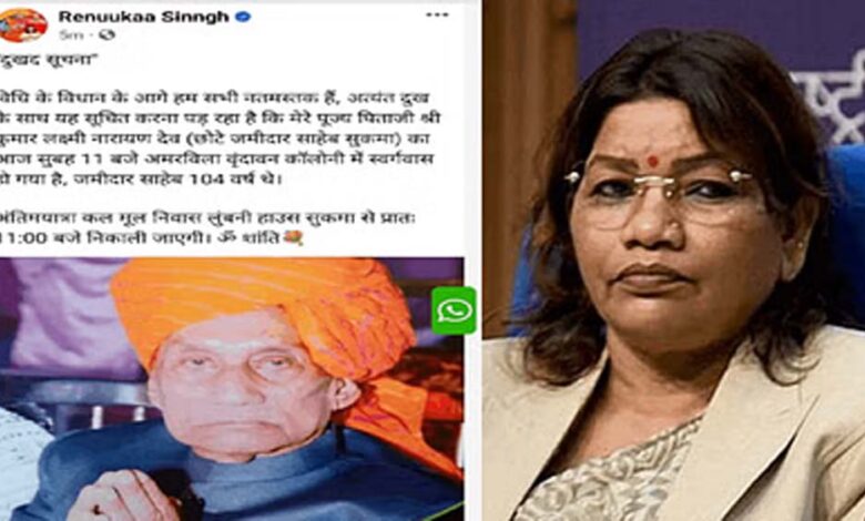 भाजपा के प्रदेश अध्यक्ष किरण सिंह देव के पिताजी लक्ष्मी नारायण देव छोटे जमीदार साहब सुकमा का 11 बजे अमरविला वृंदावन कॉलोनी में स्वर्गवास हो गया। जिसके बाद उक्त जानकारी को भाजपा प्रदेश अध्यक्ष किरण सिंह देव ने अपने फेसबुक के सोशल मीडिया प्लेटफार्म पोस्ट किया था। जिसके बाद हुबहू पूर्व केंद्रीय मंत्री एवं सोनहत भरतपुर की नवनिर्वाचित विधायक रेणुका सिंह ने अपने सोशल मीडिया अकाउंट से पोस्ट किया। जिसके बाद कई लोगों ने समझा कि रेणुका सिंह के पिता का निधन हो गया है। हालांकि बाद में विधायक को गलती का एहसास होने पर उन्होंने तुरंत उक्त पोस्ट को डिलीट कर सोशल मीडिया से हटा लिया।