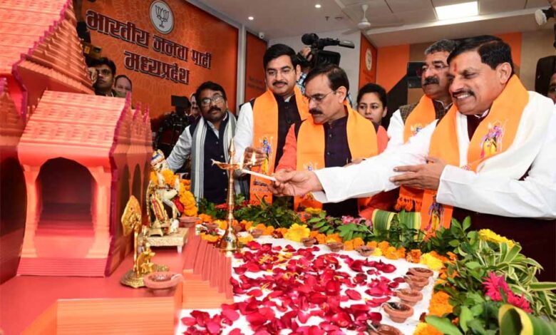 अयोध्या में भव्य मंदिर में आज भगवान रामलला की प्राण-प्रतिष्ठा समारोह के उपलक्ष्य में भारतीय जनता पार्टी प्रदेश मीडिया सेंटर में रामधुन का आयोजन किया गया। मुख्यमंत्री डॉ. मोहन यादव, प्रदेश अध्यक्ष व सांसद विष्णुदत्त शर्मा और प्रदेश संगठन महामंत्री हितानंद ने मीडिया सेंटर में रामधुन में शामिल हुए और हनुमान चालीसा, रामधुन व राम रक्षास्रोत का पाठ किया। इसके पश्चात मुख्यमंत्री डॉ. मोहन यादव और प्रदेश अध्यक्ष विष्णुदत्त शर्मा और प्रदेश संगठन महामंत्री हितानंद ने सफाई मित्रों को श्रीफल और कंबल देकर सम्मानित किया। इस अवसर पर प्रदेश शासन के मंत्री विश्वास सारंग, पार्टी के प्रदेश उपाध्यक्ष आलोक शर्मा, सीमा सिंह जादौन, प्रदेश कार्यालय मंत्री डॉ. राघवेंद्र शर्मा, प्रदेश मीडिया प्रभारी आशीष अग्रवाल ने हनुमान चालीसा का पाठ किया व स्वच्छता मित्रों का सम्मान किया।