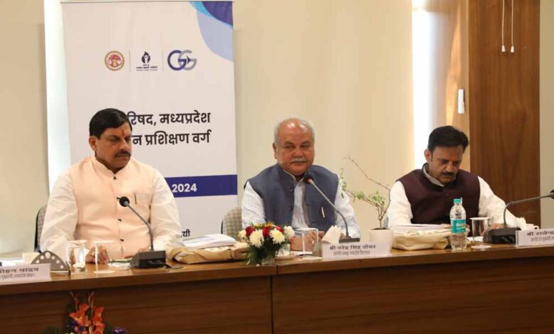 प्रधानमंत्री नरेंद्र मोदी और केंद्रीय संगठन के साथ काम चुके चार प्रमुख नेता रविवार को मंत्रियों को टिप्स दे रहे हैं। केंद्र सरकार में मंत्री रह चुके एवं मध्य प्रदेश विधानसभा के अध्यक्ष नरेंद्र सिंह तोमर ने बताया कि राज्य स्तर पर प्रशासनिक समन्वय कैसे हो, इसे लेकर सभी को टिप्स दिए और उन्हें बताया कि किस तरह से इस व्यवस्था में काम करना होता है। इससे पहले मुख्यमंत्री डॉ. मोहन यादव ने नरेंद्र सिंह तोमर को औषधी पौधा सौंपकर उनका स्वागत किया। तोमर के बाद पूर्व केंद्रीय मंत्री एवं प्रदेश सरकार के मंत्री प्रहलाद पटेल ने बजट पर विस्तार से मंत्रियों को बताया।