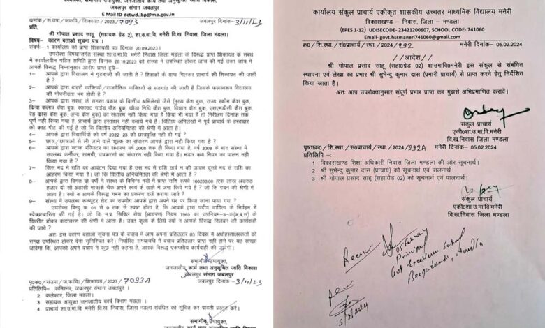 संभागीय उपायुक्त, जनजातीय कार्य तथा अनुसूचित जाति विकास, जबलपुर संभाग जबलपुर द्वारा पत्र क्रमांक / सं.उपा/जकवि/शिकायत/2023/7093 दिनांक-3/11/23 को कारण बताओ नोटिस जारी कर गोपाल प्रसाद साहू (सहायक ग्रेड 2), शा.उ.मा.वि. मनेरी वि.ख. निवास, नोटिस मे कहा है कि आपके विरूद्ध प्राप्त शिकायत के संबंध में कार्यालयीन गठित समिति द्वारा दिनांक 26.10.2023 को संस्था में उपस्थित होकर 01से 09 बिंदुओं की जांच की गई उक्त जांच में आपके विरूद्ध आरोप प्राप्त हुए जिससे स्पष्ट होता है, कि आपके द्वारा पदीय दायित्व के निर्वहन में स्वेच्छाचारिता की गई है। जो कि म.प्र. सिविल सेवा (आचरण) नियम 1965 का उपनियम-3-क (अ,ब,स) के विपरीत होकर कदाचरण की श्रेणी में आता है। उक्त कृत्य के लिये क्यों न आपके विरूद्ध निलंबन की कार्यवाही की जावे ?