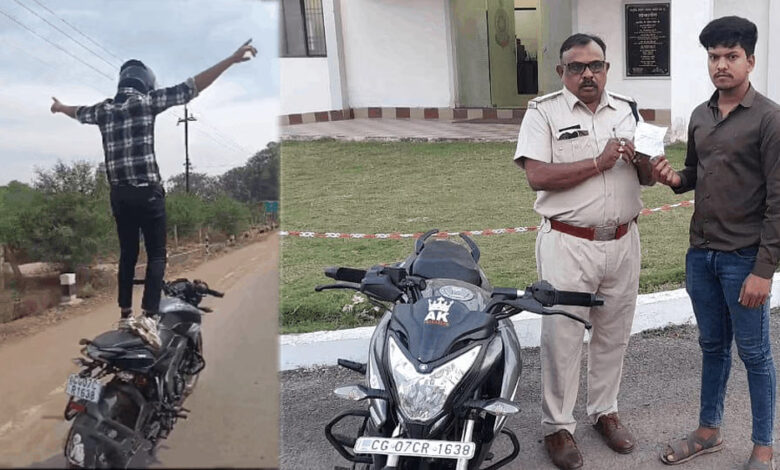 जिले में बाइक स्टंटबाजों के खिलाफ लगातार कार्रवाई की जा रही है। इसी कड़ी में मरोदा ओवर ब्रिज के आगे व्यस्ततम मार्ग पर एक युवक को सीट पर खड़े होकर बाइक चलाना भारी पड़ गया। युवक का स्टंट का वीडियो सोशल मीडिया पर तेजी से वायरल हो रहा है। यातायात पुलिस के हेल्पलाइन नंबर पर वीडियो पहुंचा और वीडियो के आधार पर वाहन नंबर सीजी 07 सीआर 1638 के चालक की पहचान हुई।