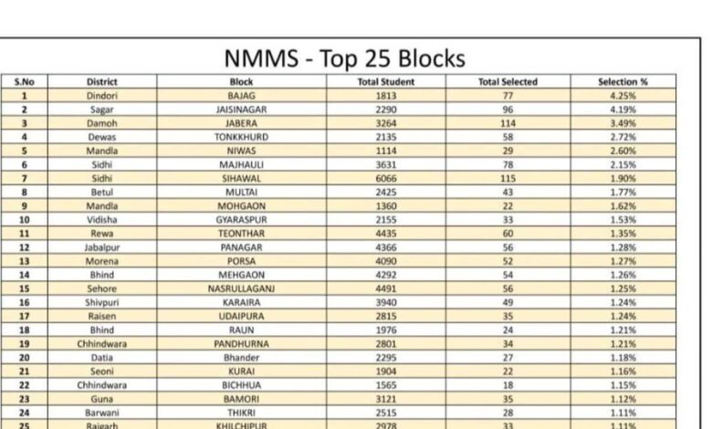 केंद्र सरकार की नीति के अनुसार मध्य प्रदेश शासन द्वारा भी आयोजित किया गया था जिसमें कक्षा 8 के बच्चों को टेस्ट देने का अवसर प्रदान किया गया था। कमजोर आर्थिक स्थिति के बच्चों का अध्यापन कार्य राशि के अभाव में बाधित ना हो, इस उद्देश्य को लेकर टेस्ट उत्तीर्ण करने वाले बच्चों को ₹12000 प्रति वर्ष दिए जाते हैं ।बड़े हर्ष का विषय है कि मंडला जिला इस मामले में मध्य प्रदेश में अग्रणी रहा तथा मध्य प्रदेश में नंबर पांच पर निवास विकास खंड जहॉ 29 बच्चे और नंबर 9 पर मोहगांव विकासखंड जहॉ 22 बच्चों ने परीक्षा उत्तीर्ण कर मंडला का नाम रौशन किया एवं अपने भविष्य को सुरक्षित किया इस संदर्भ में कलेक्टर मंडला डॉ सलोनी सिडाना एवं सीईओ श्री श्रेयांश कूमट का विशेष प्रोत्साहन योगदान रहा साथ ही जिला शिक्षा केंद्र के डीपी सी श्रीमती मुन्नी बरकड़े तथा ए पी सी डॉ. शेषमणि गौतम का भी विशिष्ट योगदान कहा जाएगा संबंधित विकासखंड के बी आर सी निवास श्री सुनील कुमार दुबे एवं मोहगांव विकासखंड में बी आर सी डॉ विनीत कुमार दुबे ने बच्चों को इस परीक्षा में सम्मिलित होने एवं स्कॉलरशिप प्राप्त कर अपनी पढ़ाई को निरंतर जारी रखने के उद्देश्य से टेस्ट में सम्मिलित होने प्रोत्साहित किया इससे मंडला नगर गौरवॉन्वित हुआ*। जिसमें निवास ब्लाक को पांचवां स्थान प्राप्त हुआ निवास टीम को विशेष बथाई एवं विशेष कर छात्र छात्राओं, एवं बी ई ओ, प्राचार्य, जनशिक्षक, एवं स्टॉप को जिनके नेतृत्व एवं प्रयास से यह मुकाम हासिल किया है।