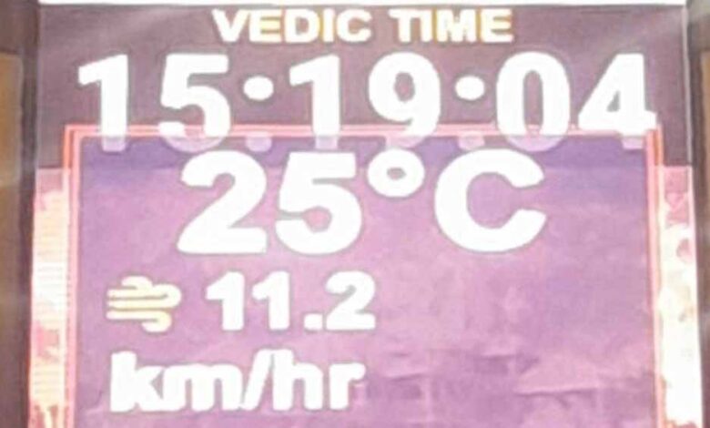 विश्व की पहली वैदिक घड़ी ‘काल गणना के केंद्र’ माने गए उज्जैन में स्थापित कर दी गई। घड़ी, 30 मुहूर्त के साथ वैदिक, भारतीय मानक समय और ग्रीनविच मिन टाइम और समय बता रही है और इसके बैकग्राउंड में हर घंटे देश-दुनिया के खूबसूरत पर्यटन स्थलों की तस्वीर बदल रही है। घड़ी में पल-पल शहर का तापमान, हवा की गति, मौसम में नमी, हिंदू कैलेंडर अनुरूप माह का नाम भी दर्शाया जा रहा है।