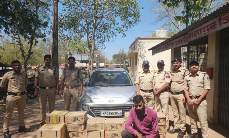 जिसके चालक संतोष मालवीय पिता सखाराम जाति कलाल निवासी सोनगाँव थाना बाग की कार की तलाश लेते कार मे अवैध रूप से ले जाई जा रही 25 पेटी शराब जिसमें 16 पेटी अंग्रेजी गोवा शराब व 9 पेटी देशी प्लेन शराब किमती एक लाख 25 हजार रूपये व सेन्ट्रो कार MP 09 WE 3848 किमती पाँच लाख रूपये कुल किमती 6 लाख 25 हजार रूपये की जप्त कर आऱोपी संतोष मालवीय पिता सखाराम मालवीया जाति कलाल निवासी सोनगाँव थाना बाग को गिरफ्तार किया गया । सराहनीय कार्य – उक्त कार्यवाही में निरीक्षक श्री कमलेश सिंगार थाना प्रभारी मनावर, राहुल चौहान, राजेश हाडा, गौरेलाल शुक्ला, नवलसिंह डामोर,सौरभ,वकील चौहान,दिनेश सौंलकी,प्रदीप कन्नौज का सराहनीय योगदान रहा।