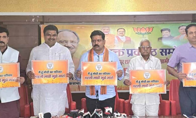 छत्तीसगढ़ के उप मुख्यमंत्री विजय शर्मा ने नेता प्रतिपक्ष चरणदास महंत द्वारा प्रधानमंत्री नरेंद्र मोदी पर की गई टिप्पणी का कड़ा प्रतिकार करते हुए कहा है, 'मैं भी हूं मोदी का परिवार और कांग्रेस के नेता पहली लाठी मुझे मारें।' श्री शर्मा ने कहा कि भारतीय जनता पार्टी 'मैं भी हूं मोदी का परिवार, पहले लाठी मुझे मारो' इस विषय को लेकर जनता तक जाएगी और जनता इस प्रकार के अमर्यादित बयान देने वालों को सजा देगी। श्री शर्मा बुधवार को एकात्म परिसर स्थित भाजपा कार्यलय में पत्रकार वार्ता को संबोधित कर रहे थे।