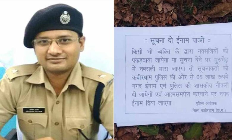 दरअसल छत्तीसगढ़ में BJP की सरकार बनने के बाद नक्सलियों के खिलाफ ताबड़तोड़ कार्रवाई चल रही है. चुनावी सभा में गृहमंत्री ने भी छत्तीसगढ़ से नक्सलियों के सफाए का ऐलान कर दिया है. इस बीच कबीरधाम पुलिस ने भी एक अनोखी पहल करते हुए नक्सलियों की सूचना देने वालों को 5 लाख रुपये का इनाम देने की घोषणा की है. इसके लिए जगह-जगह पर्चे भेजे रहे हैं. जिले के नक्सल प्रभावित बॉर्डर के गांवों में 35000 लोगों के मोबाइल पर इसका मैसेज भी पुलिस ने भेजा है. जिसमें ये कहा गया है कि नक्सलियों की सूचना देने, सरेंडर करवाने और एनकांउटर में नक्सली के मारे जाने पर सूचना देने वाले को 5 लाख रुपये का इनाम तुरंत दिया जाएगा. साथ ही पुलिस विभाग में सरकारी नौकरी दी जाएगी. SP के इस ऐलान की चर्चा प्रदेश में जोरों पर हो रही है.
