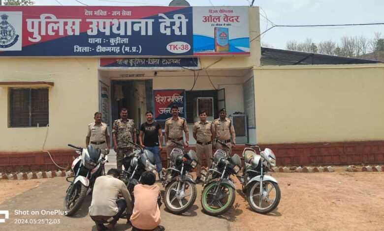 पुलिस अधीक्षक टीकमगढ रोहित काशवानी द्वारा चोरी हुए वाहनों को बरामद कर आरोपियों को गिरफ्तार करने हेतु हेतु निर्देशित किया है। इसी तारतम्य मे अतिरिक्त पुलिस अधीक्षक टीकमगढ सीताराम व एसडीओपी टीकमगढ राहुल कटरे के मार्गदर्शन में थाना प्रभारी निरीक्षक पंकज शर्मा के नेतृत्व में चौकी प्रभारी देरी उप निरीक्षक चंदन शाक्य द्वारा सूरज पिता भोला चढार उम्र 19 साल निवासी अचढट थाना नौगांव, सेवाराम पिता लल्लू चढार उम्र 21 साल निवासी देरी से चौकी देरी थाना खरगापुर अंतर्गत चोरी की गई पांच मोटर साईकिलो को दिनांक 24.05.24 को जप्त किया गया।