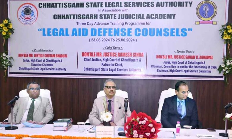 प्रशिक्षण कार्यक्रम में छत्तीसगढ़ उच्च न्यायालय के न्यायाधीश एवं छत्तीसगढ़ राज्य विधिक सेवा प्राधिकरण के कार्यपालक अध्यक्ष न्यायमूर्ति श्री गौतम भादुड़ी ने कौंसिलों से कहा कि नालसा एवं सालसा का मुख्य उद्देश्य निर्दाेष एवं जरूरतमंदों की सुरक्षा सुनिश्चित करना है। इस हेतु डिफेंस कौंसिल सिस्टम में नियुक्त सभी कौंसिल अपने कार्य को नियोजन न मानकर सेवा कार्य के रूप में जिम्मेदारी से निर्वहन करें।