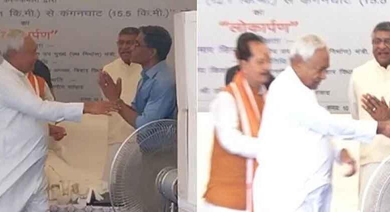 बिहार के मुख्यमंत्री नीतीश कुमार छूने लगे पैर !, गंगा पथ उद्घाटन के दौरान सभा में सब रह गए दंग