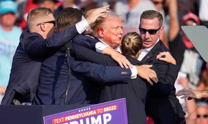 गोली चलने के बाद मची अफरा-तफरी के बीच पूर्व राष्ट्रपति और रिपब्लिकन नेता डोनाल्ड ट्रंप को एक काफिले में ले जाया गया। सोशल मीडिया पर वायरल हुए वीडियो में ट्रंप के कान से खून बहता देखा जा सकता है। हालांकि, इस संबंध में कोई आधिकारिक पुष्टि नहीं हुई। सुरक्षा एजेंसियों की तरफ से जारी बयान के मुताबिक ट्रंप सुरक्षित हैं। इस घटना की चौतरफा निंदा की जा रही है। बाइडन, कमला हैरिस, पूर्व राष्ट्रपति ओबामा ने दो टूक कहा है कि अमेरिकी समाज में हिंसा की कोई जगह नहीं है। सीक्रेट सर्विस प्रवक्ता एंथनी गुग्लिल्मी ने कहा कि पेन्सिलवेनिया में 78 वर्षीय ट्रंप की रैली वाली जगह पर मौजूद सुरक्षाकर्मियों ने शूटर को मार गिराया। सीक्रेट सर्विस के जवान जब ट्रंप को मंच से दूर सुरक्षित जगह पर ले जा रहे थे, उसी समय उनके समर्थकों ने उनके समर्थन में नारे लगाए। ट्रंप को हवा में मुट्ठी बांध कर कुछ कहते देखा गया।