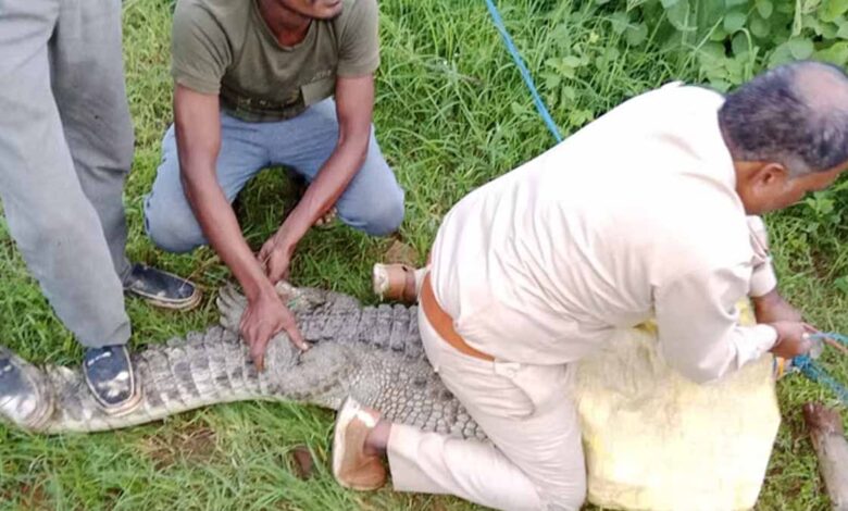 तेंदूखेड़ा के केवलारी गांव में नदी से निकलकर मगरमच्छ सुबह मुख्य सड़क पर आया, विभाग की टीम ने रेस्क्यू किया