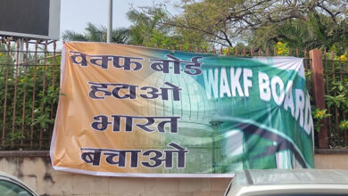 भोपाल में मिंटो हॉल के बाहर वक्फ बोर्ड हटाओ भारत बचाओ के पोस्टर लगाए गए